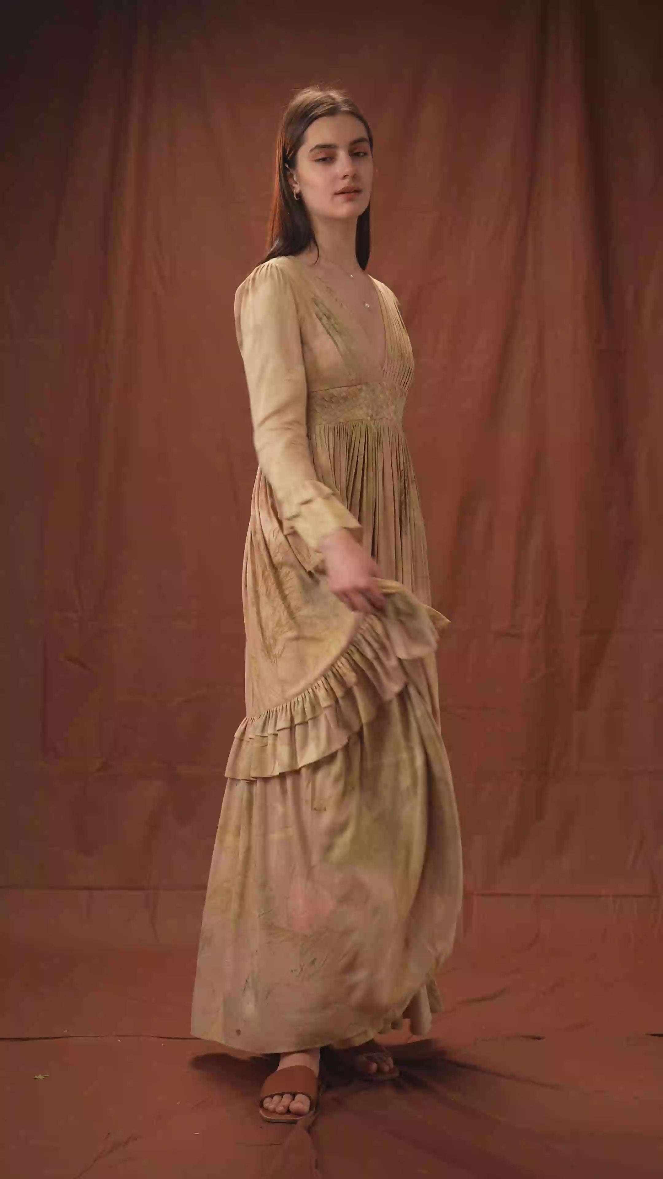 A V-neck Tiered Maxi Dress with Layered Flounce Sleeves, embodying timeless elegance and intricate craftsmanship. Inspired by British vintage aesthetics and bohemian charm, this dress combines thoughtful details with sustainable materials. Crafted from organic banana fabric and lined with mul cotton, it features muted botanical prints that bring the design to life.