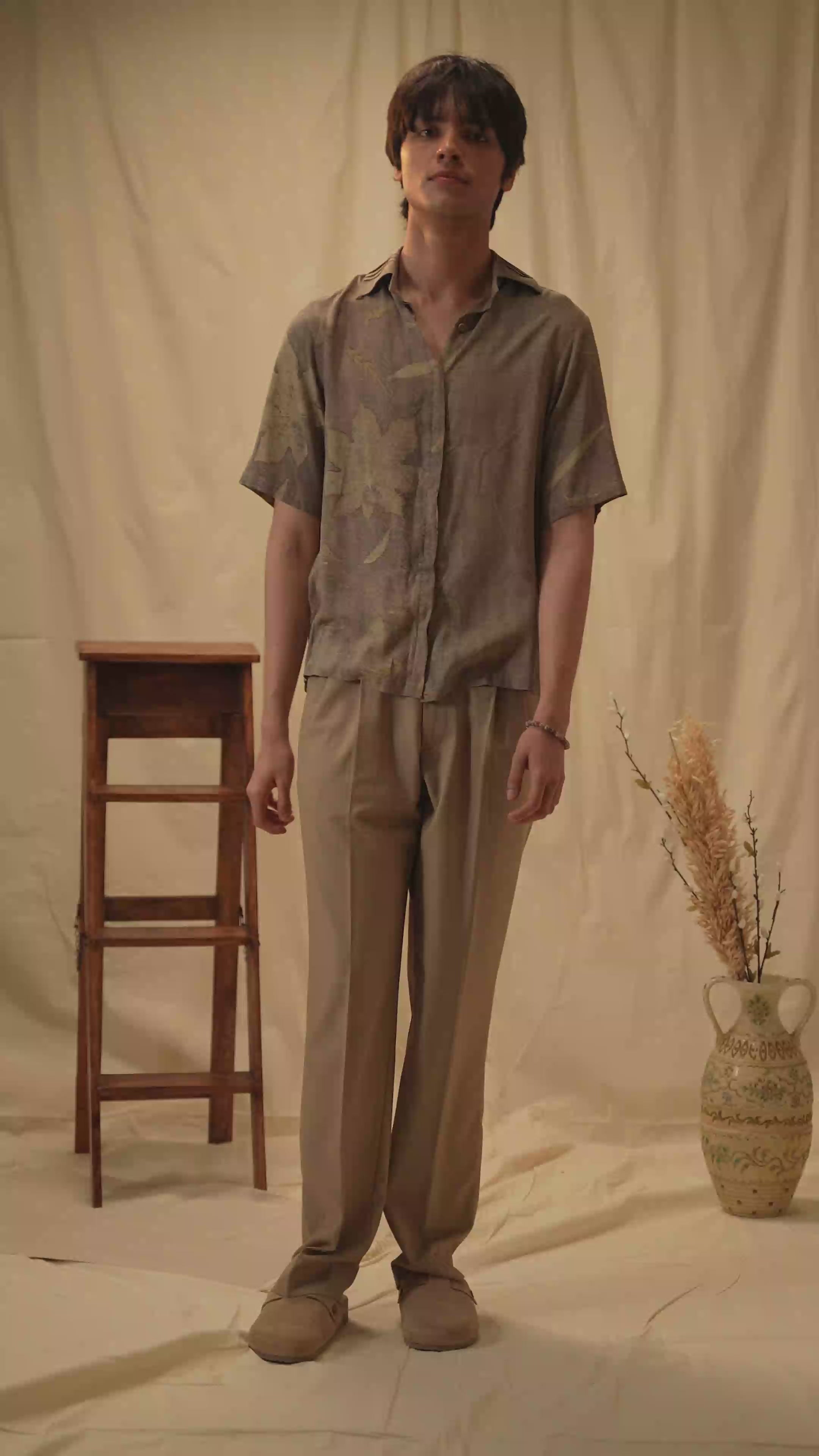 This deep grey eco-dyed shirt is made from luxurious banana fiber fabric, combining bold design with sustainability. The shirt features soft beige botanical patterns for an earthy, organic vibe, making it a staple for year-round style.