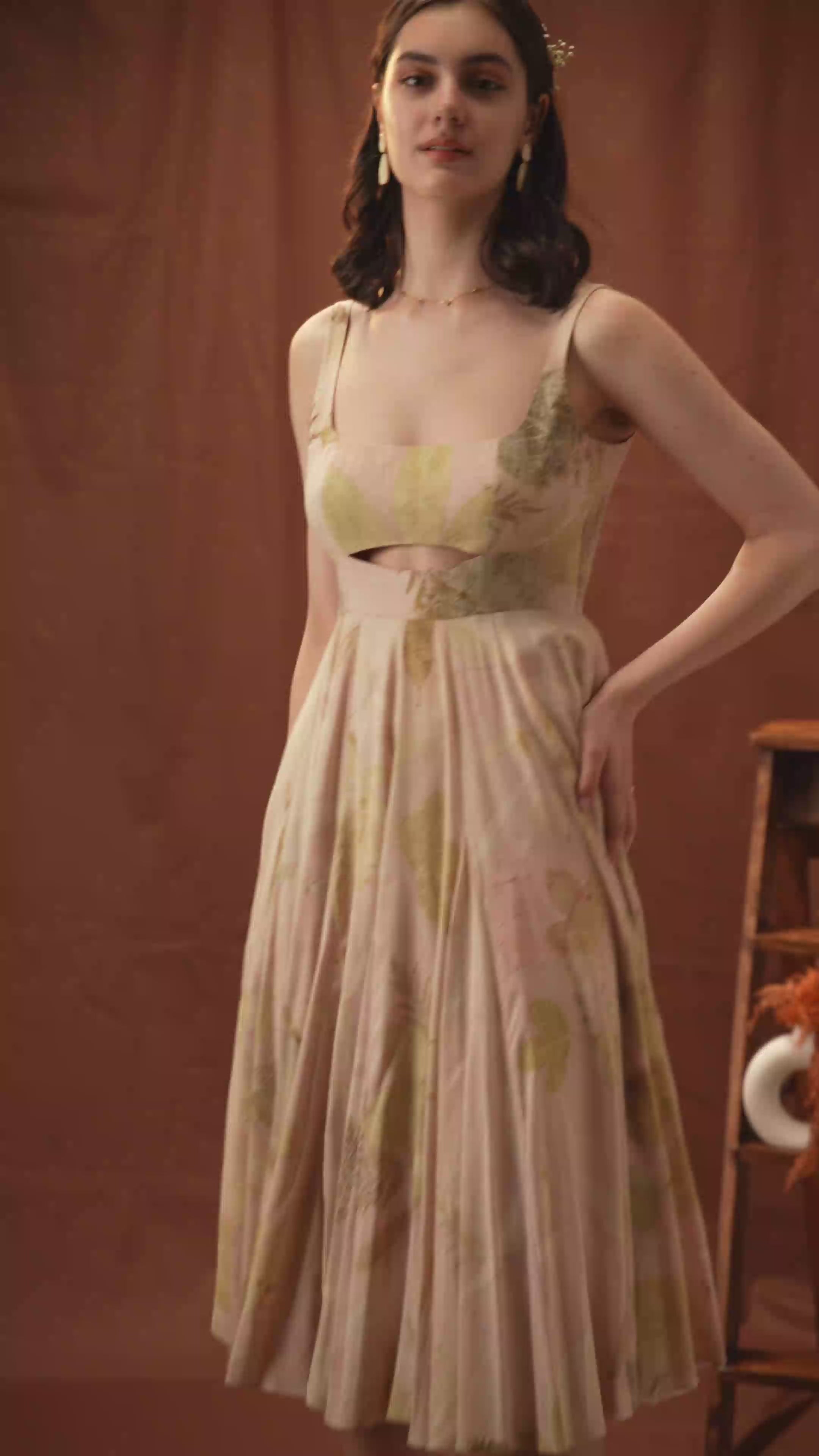 A sleeveless midi dress with a square neckline, front cut-out detail, and a goded panel skirt for added movement. Made from eco-printed banana fabric with soft pastel leaf imprints, perfect for casual or semi-formal wear.