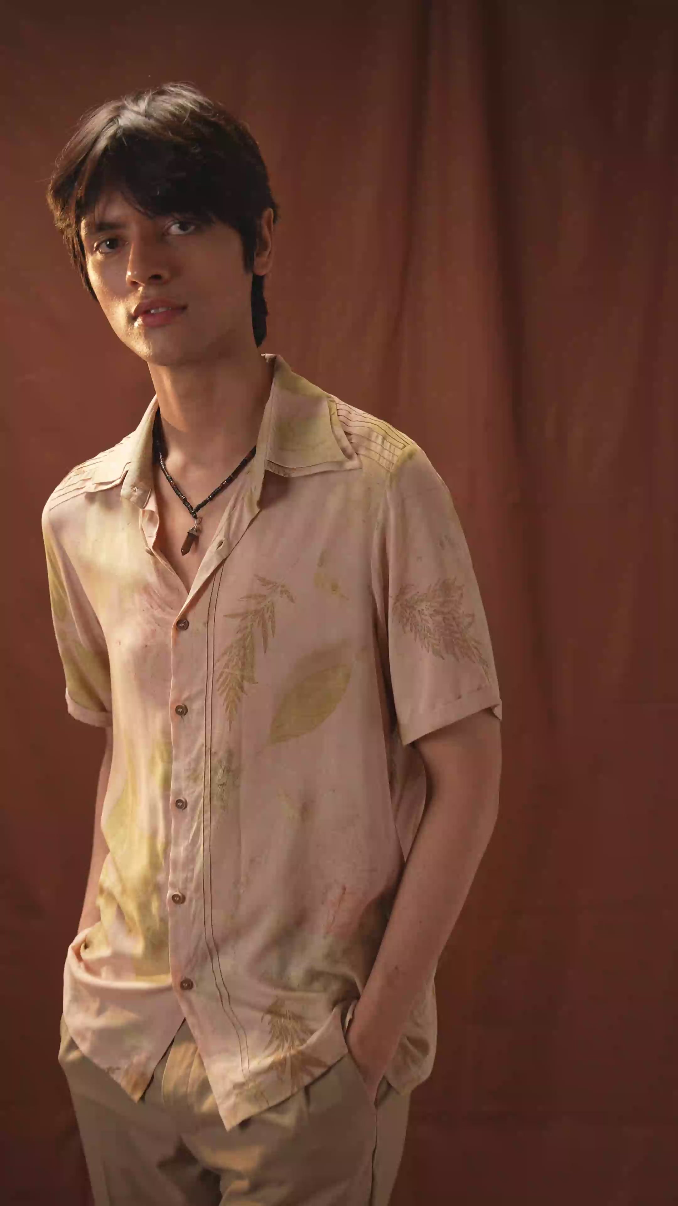 A lightweight, relaxed-fit shirt crafted from sustainable banana fiber fabric with a soft pastel pink base and hand-printed leaf and floral imprints. The eco-dyed design highlights nature's beauty while providing unmatched comfort. Perfect for casual outings and summer getaways.