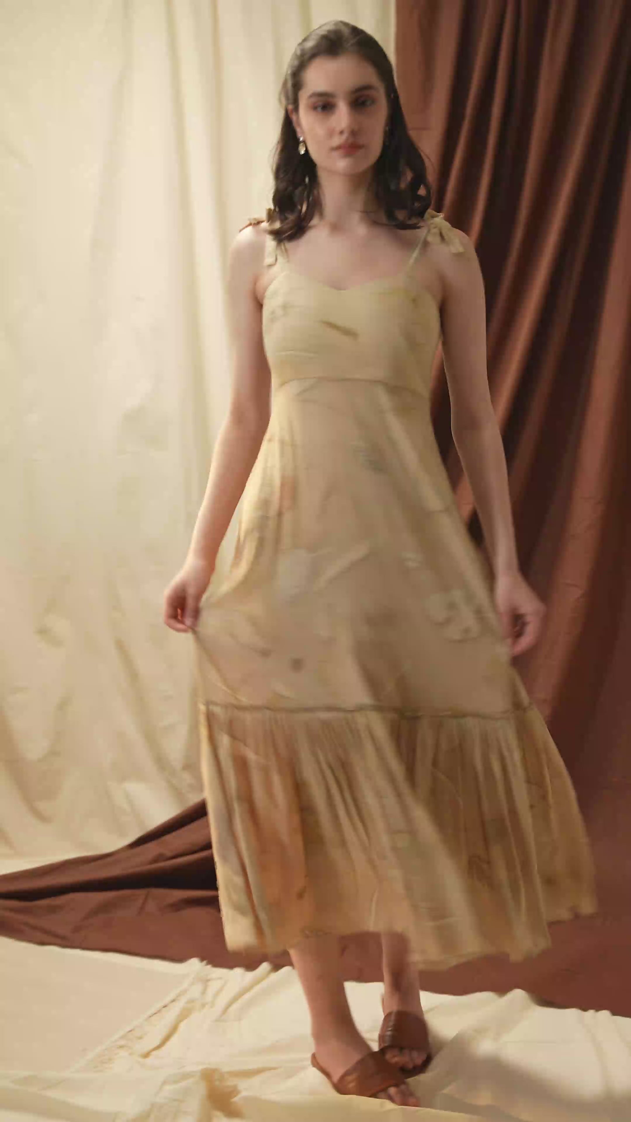 A breezy, strappy maxi dress with adjustable tie-up straps and a gathered tiered hemline for a relaxed flow. Designed in breathable banana fabric with subtle leaf impressions, perfect for summer and vacations.